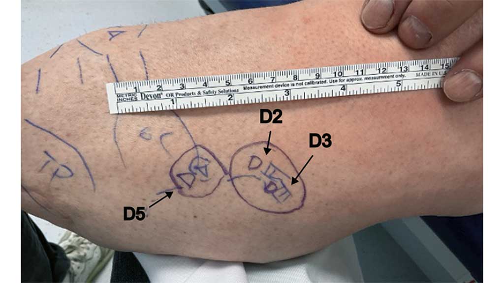 Der erste Operationsschritt umfasst die Darstellung, Freilegung und Mobilisation des Nervus suralis in dem dorsalen Hautlappen zwischen den beiden Bäuchen des M. Gastrocnemius sowie die Resektion eines ggf. vorhandenen Neuroms. Anschließend wird der Nervus saphenus oberhalb der Innenseite des Knies dargestellt, präpariert und durchtrennt (Denervierung), wodurch die sensible Innervation der Haut distal des medialen Oberschenkels und folglich auch der Innenseite des Unterschenkels unterbrochen wird. Um einer Neurombildung vorzubeugen, wird der proximale Nervenstumpf des Nervus saphenus in das Muskelgewebe der Adduktorengruppe eingebettet und versenkt. Der distale Anteil des Nervus saphenus wird mit dem aus dem Unterschenkel ausgelösten und tunnelierten Nervus suralis durch eine mikrochirurgische Naht auf der Höhe des medialen Knies verbunden. Die Nervenfasern des Nervus suralis wachsen nun entlang des distalen Anteils des Nervus saphenus als eine Art Leitschiene in den medialen Unterschenkelstumpf ein und reinnervieren diesen42. Teile der Fußsohle werden nach abgeschlossener Reinnervation erwartungsgemäß am medialen Unterschenkelstumpf empfunden. Diese Empfindung bezeichnen wir als Limb Map (Abb. 7). Die Reinnervation hat eine zu erwartende Geschwindigkeit von 1 mm/Tag43 44 45. Der Fortschritt der Reinnervation kann durch Beklopfen (Hofmann-Tinel-Zeichen) überwacht werden. Wir fordern die Patienten auf, Empfindungen mit einem hautfreundlichen Stift am Unterschenkel einzuzeichnen. Sobald die Limb Map stabil und die Reinnervation abgeschlossen ist, kann die Stimulationseinheit an dieser Stelle in den Schaft implementiert werden. Eine transtibiale TSR ist bei der primären Amputation, aber auch bei Stumpfkorrekturen oder Revisionen möglich.