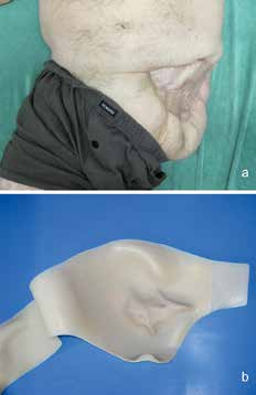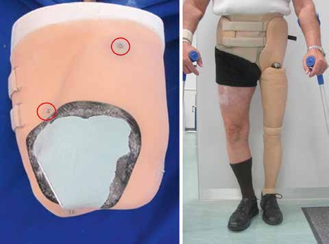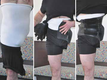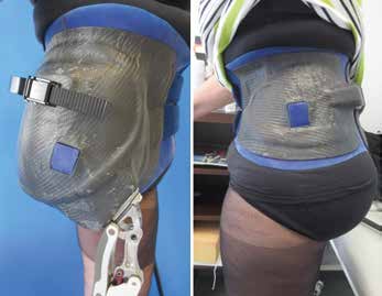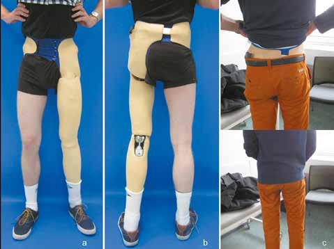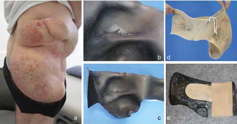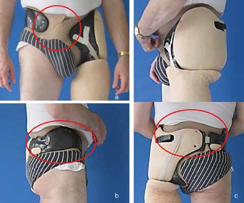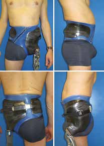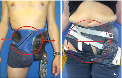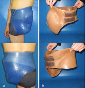 Das Ver­sor­gungs­sys­tem besteht aus einer hoch­tem­pe­ra­tur­ver­net­zen­den HTV-Sili­kon­ho­se mit einer ven­tra­len Ver­schluss­tech­nik. Die HTV-Sili­kon-Mischun­gen kön­nen mit varia­bler Shore-Här­te in den Shore-Här­te­be­rei­chen A 50 bis A 80 zum Ein­satz kom­men. Sie wer­den in Abhän­gig­keit von der Gewe­be­be­schaf­fen­heit des Stump­fes wei­cher oder här­ter ein­ge­stellt. Die Ver­schluss­tech­nik hat sich zwi­schen­zeit­lich von einer sel­te­ner ein­ge­setz­ten Zip-Ver­schluss­tech­nik (Abb. 3a) hin zu einer Klett­ver­schluss­tech­nik (Abb. 3b) ent­wi­ckelt. Dadurch wird eine Erleich­te­rung des Hand­lings und eine ver­bes­ser­te Funk­ti­on im Sin­ne einer dosier­ba­ren stär­ke­ren Vor­kom­pres­si­on der Weich­tei­le erzielt. Bei schlecht weich­teil­ge­deck­ten Stümp­fen, wenig ver­schieb­ba­rem Nar­ben­ge­we­be oder emp­find­li­chen Haut­area­len wer­den nie­der­sho­ri­ge raum­tem­pe­ra­tur­ver­net­zen­de RTV-Sili­kon­gel­area­le in die Hüft­ho­se ein­ge­ar­bei­tet (Abb. 4a u. b).