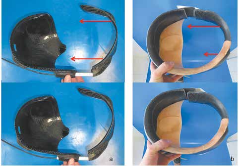 Der Glei­ter-Ver­schluss hin­ge­gen gibt die Mög­lich­keit, die lich­ten Wei­ten in M‑L fron­tal wie dor­sal in glei­cher Wei­se zu redu­zie­ren und den Stumpf ins­ge­samt in den Korb zu zen­trie­ren. Die rat­schen­ar­ti­ge Ein­hand­be­die­nung des Mam­mut-Ele­men­tes erleich­tert eine situa­ti­ons­ab­hän­gi­ge Ein­stel­lung. Der ven­tra­le Bereich rund um das Abdo­men wird bei die­ser Ver­schluss­tech­nik mit mehr Kom­fort aus­ge­stat­tet. Durch die elas­ti­schen Eigen­schaf­ten des Sili­kons und durch einen redu­zier­ten Schaft­an­teil des Pre­preg-Con­tai­ners kann die Hose bei Bauch­at­mung nach ven­tral expan­die­ren. Bei einer klas­si­schen Ver­schluss­tech­nik wird das Wider­la­ger durch den ent­ste­hen­den Druck unan­ge­nehm (Abb. 12).