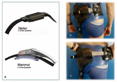 Über die Sili­kon­ho­se wird der zwei­ge­teil­te Becken­korb adap­tiert. Die Ver­schluss­tech­nik spielt hier­bei eine beson­de­re Rol­le. Vor­zugs­wei­se kommt hier­bei das Sys­tem aus dem Hau­se Ortho Sys­tems zum Ein­satz, bestehend aus den bei­den Füh­rungs­tei­len des Glei­ters und dem Ver­schluss­stück „Mam­mut” (Abb. 5a‑c). Die mecha­ni­schen Anfor­de­run­gen an die­ses Bau­teil sind je nach Weicht­eil­zu­stand und gewünsch­ter Kom­pres­si­on des Stump­fes sehr hoch. Der Glei­ter muss eine Bedie­nung auch unter Scher­kräf­ten zulas­sen, das Mam­mut soll­te hin­ge­gen ein Schlie­ßen und Ver­rie­geln unter hohen Zug­kräf­ten ermög­li­chen. Die Anord­nung der Tei­le erfor­dert eine opti­ma­le Ein­stel­lung, um der hohen Belas­tung standzuhalten.