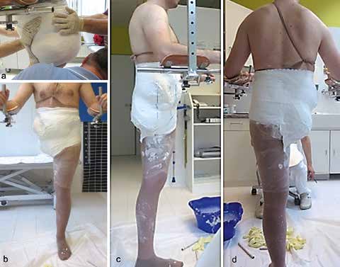 Als dor­sa­les Wider­la­ger dient der gepols­ter­te Bauch des Tech­ni­kers. Die­se Gips­ab­druck­tech­nik bedeu­tet vol­len Ein­satz der Tech­ni­ker; der Anwen­der steht mit einer phy­sio­lo­gi­schen Lor­do­se und einem aus­ge­rich­te­ten Becken sicher im Pati­en­ten­stand (Abb. 6b‑d).