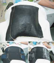 Die nächs­ten Arbeits­schrit­te bestehen in der Anfer­ti­gung der Sili­kon­ho­se. Die HTV-Sili­kon­haut ent­steht im Auf­le­ge­ver­fah­ren des Sili­kons über dem Gips­mo­dell, wel­ches die fina­le Zweck-Volu­men­form hat. Die ermit­tel­ten und ange­dach­ten Funk­ti­ons­ele­men­te wer­den ein­ge­bracht. Die Lasche wird ange­fer­tigt, Weich­bet­tun­gen ein­ge­ar­bei­tet und die Ver­stär­kun­gen der Umlenk­schlau­fen mit dem Sili­kon ver­bun­den (Abb. 8).