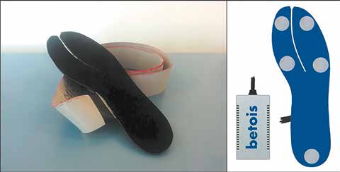 Bei betois (Abb. 1) handelt es sich um ein neues Innensohlenmesssystem für die Ermittlung von Biege- und Torsionsbelastungen am Fuß. Das „Key Feature” der Messsohle ist eine speziell geformte, elastische Trägerschicht, an der an verschiedenen Messstellen Dehnungsmesssensoren positioniert sind. Durch die spezielle Form des Trägers können Biege- und Torsionsmomente im Schuh in verschiedenen Fußarealen unabhängig analysiert werden. Die Sensoranordnung und ‑verschaltung ermöglicht eine parallele Aufnahme von Biege- und Torsionsbelastungen. Messstellen befinden sich beispielsweise proximal der distalen Interphalangeal-Gelenke I (DIP I) und V (DIP V), proximal der Metatarsophalangeal-Gelenke I (MTP I) und V (MTP V) sowie distal des Processus calcaneus. Die Datenaufnahme erfolgt über einen Analog-digital-Wandler, der die Daten kabellos mittels Bluetooth überträgt. Mit einer Messfrequenz von bis zu 125 Hertz können alltägliche sowie langsame sportliche Aktivitäten – zum Beispiel Gehen und Joggen – untersucht werden. Die Messsoftware ermöglicht eine schnelle, automatische Auswertung von Standardparametern von bis zu vier Untersuchungsbedingungen (z. B. verschiedene Prothesenfüße) für die tägliche Praxis sowie den Export der Rohdaten für wissenschaftliche Untersuchungen.