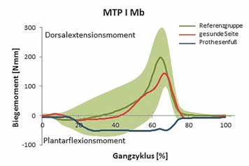 Die Mittelwertverläufe dieser Messung sind ebenfalls in Abbildung 2 dargestellt. Die rote Kurve stellt den Biegemomentenverlauf des kontralateralen, gesunden Fußes proximaldes MTP I dar. Es lässt sich erkennen, dass sich der gesamte Kurvenverlauf im Bereich der grünen Fläche und dementsprechend im 95-%-Konfidenzintervall der gesunden Vergleichsgruppe befindet. Sie weicht lediglich im Übergang von der Stand- zur Schwungphase etwas verstärkt von der Mittelwertkurve der Vergleichsgruppe ab. Sie liegt aber dennoch im Bereich des 95-%-Konfidenzbandes. Somit können keine Unterschiede für die kontralaterale Seite im Vergleich zur Kontrollgruppe festgestellt werden. Für die Prothesenseite (siehe Abb. 2, blaue Linie) lässt sich ein veränderter Verlauf erkennen: Zu Beginn der Standphase befindet sich der Verlauf ebenfalls in der hellgrünen Fläche. Es tritt in diesem Fall ein Plantarflexionsmoment auf. Dies bleibt auch nach 30 % des Gangzyklus bestehen. Von 26 % des Gangzyklus bis 64 % bildet der Verlauf ein Plateau mit –50 Nmm. Anschließend nimmt das Moment wieder ab. Es lässt sich deutlich erkennen, dass im Übergang zur Schwungphase der Verlauf stark von der Vergleichsgruppe abweicht.