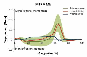 Eine weitere mögliche Ursache ist die Positionierung der Messstellen. Liegen diese nicht im Kontaktbereich, so kann die Messsohle in den Hohlraum unterhalb der Feder gedrückt und somit eine Verbiegung in Richtung Plantarflexion hervorgerufen werden. Dies zeigt sich auch an den Unterschieden des Verlaufes zwischen MTP I und MTP V des Prothesenfußes. An MTP I wird ein reines Plantarflexionsmoment, an MTP V dagegen ein Dorsalextensionsmoment gemessen. Da bislang nur die Belastung zwischen Fuß und Schuh und nicht zwischen Prothesenfuß und Schuh gemessen wurde, muss hier die Positionierung der Messstellen am Prothesenfuß überprüft werden.