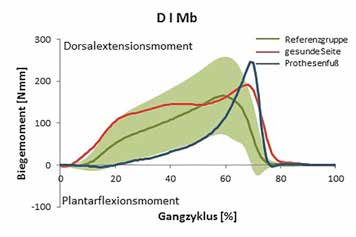 Betrachtet man diese Verbiegungen und Verdrehungen bei zyklischen Bewegungen wie dem Gehen, so resultiert aus dem wechselnden Plantarflexions- und Dorsalextensionsmoment bzw. der Verdrehung in Richtung Fußlängsachse und entgegengesetzt eine sogenannte Wechselbelastung, die über Druckverteilungsmessungen nicht detektiert werden kann. Das gleiche physikalische Prinzip gilt für den Prothesenfuß. Ein Unterschied besteht jedoch darin, dass ein konventioneller Prothesenfuß kein Sprunggelenk aufweist und somit die Verbiegung der gesamten Carbonfeder bestimmt wird. Betrachtet man den anatomischen Fuß, so ist es möglich, eine Dorsalextension im Sprunggelenk durchzuführen, ohne dass sich das Biegemoment unterhalb des Mittelfußes verändert. Im Gegensatz dazu führt die scheinbare Dorsalextension des Prothesenfußes zu einer Veränderung der gemessenen Biegemomente, da sich die gesamte Carbonfeder verbiegt. Aufgrund seines Aufbaus, der teilweise mit einer Feder verglichen werden kann, löst sich in der terminalen Standphase die Verformung der Carbonfeder wieder auf, wodurch die oben beschriebene Unterstützung des Abrollverhaltens erfolgt.
