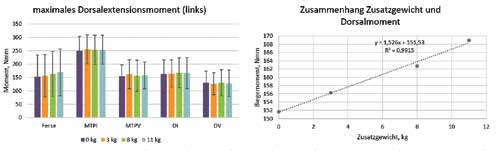 Die Arbeitssicherheit ist für Arbeitnehmer und Arbeitgeber ein weitreichendes Themengebiet. Ein Teilbereich ist hierbei die Vermeidung von Überlastungen durch zu schweres oder zu häufiges Tragen von Lasten. Um zu ermitteln, ob anhand der Beurteilung der Biege- und Torsionsmomente am Fuß eine Aussage darüber getroffen werden kann, ob und wie viel Last getragen wird, wurden 8 Probanden (3 w, 32 ± 6 Jahre, BMI 23 ± 3 kg/m2) in einem Neutralschuh (Adidas Samba) vermessen. Von jedem Probanden wurden beim Gehen auf freier Strecke mindestens 5 Doppelschritte aufgenommen. Die Probanden gingen dabei einmal ohne zusätzliches Gewicht und jeweils einmal mit Zusatzgewichten von 3 kg, 8 kg und 11 kg. Die Lasten wurden dabei nahe am Körper vor der Brust getragen, der Rücken war gestreckt. Ausgewertet wurde jeweils nur der linke Fuß. Abbildung 9 stellt das maximale Dorsalextensionsmoment gemittelt über die Probanden dar. Hierbei ist erkennbar, dass das maximale Dorsalextensionsmoment an der Ferse mit steigendem Gewicht ansteigt. Bringt man das maximale Dorsalextensionsmoment unter der Ferse in direkten Zusammenhang mit den getragenen Gewichten, so ist ein linearer Zusammenhang erkennbar (s. Abb. 9). Auf weitere statistische Auswertungen wird aufgrund des geringen Stichprobenumfangs verzichtet. Erst eine Erweiterung der Probandenanzahl ermöglicht die Untersuchung der Ergebnisse auf signifikante Unterschiede.