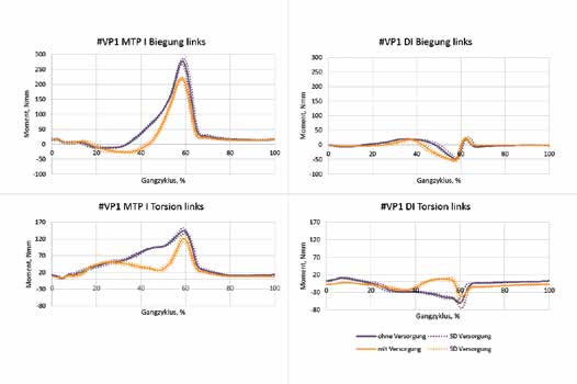 Die Biegemomentverläufe der kontralateralen Seite verlaufen unabhängig von dem auf der anderen Seite getragenen Prothesenfuß in beiden Messungen sehr ähnlich. Gleiches gilt für die Torsionsmomentenverläufe (nicht dargestellt). Auch die größten Unterschiede zwischen den beiden Prothesenfüßen zeigen sich für die Torsionsbelastung an den medialen Messstellen.