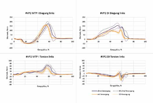 Hierbei wurden zwei Probanden (w, 35 Jahre, BMI: 24 kg/m2 und m, 36 Jahre, BMI: 25 kg/m2) mit beidseitigem (#VP1) bzw. einseitigem (#VP2) Hallux valgus beim Gehen auf freier Strecke mit einer selbstgewählten Geschwindigkeit vermessen. Ausgewertet wurden jeweils mindestens acht Doppelschritte des linken (betroffenen) Fußes. Die Probanden trugen ihre eigenen Schuhe und wurden jeweils einmal mit und einmal ohne Versorgung untersucht. Das Messsystem „vebitoSCIENCE“ wurde hierbei unter der Einlagenversorgung getragen. Die Abbildungen 10 und 11 stellen die gemittelten Biege- und Torsionsmomente über den Schrittzyklus an MTP I und D I dar. Zunächst wird deutlich, dass beide Probanden unter beiden Bedingungen stark unterschiedliche Ausprägungen und Verläufe der Biege- und Torsionsmomente aufweisen. Bei Betrachtung der Kurvenverläufe mit Versorgung wird deutlich, dass die Versorgung bei #VP1 zu stärkeren Veränderungen als bei #VP2 führt. Betrachtet man die Torsion an MTP I und D I, so führt die Versorgung dazu, dass sich die Verläufe zwischen den beiden Probanden annähern. Dies deutet darauf hin, dass die Versorgung den Bewegungsablauf und somit die Biege- und Torsionsbelastung des Fußes verändert. Um eine wissenschaftliche Aussage über die Funktionalität der hier dargestellten Einlagen zu treffen, ist eine größere Probandenanzahl notwendig, allerdings lässt sich zeigen, dass Einlagen grundsätzlich Änderungen der Biege- und Torsionsbelastungen erzielen können.
