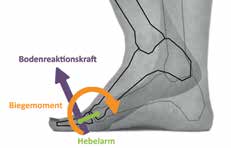 - die Dorsalextensionsbelastung in den Zehengrundgelenken während der späten Standphase des Schrittzyklus (Abb. 2) – bei verschiedenen Vorfußbeschwerden wie z. B. Hallux valgus, Hallux limitus oder rigidus gilt es, diese Belastung am Metatarsophalangealgelenk I (MTP I) durch diverse orthopädische Maßnahmen zu minimieren;