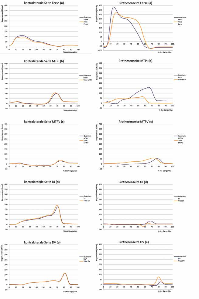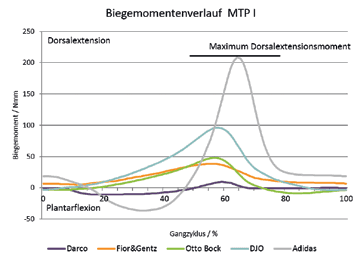 Die Biegemomente der unterschiedlichen Prothesenfüße weisen pro Proband größere Unterschiede als die Momente auf der unversorgten Seite auf. Beim aufgeführten Beispiel sind die deutlichsten Unterschiede an den Messstellen MTP I und D I zu sehen. Insgesamt bedeutet dies, dass das Tragen verschiedener Füße auf der Prothesenseite Biege- und Torsionsmomente hervorruft, die sich im Vergleich zur kontralateralen Seite, aber auch untereinander unterscheiden. Da nicht nur die maximale Ausprägung, sondern im medialen Vorfußbereich auch der charakteristische Verlauf verschieden ist, liegen hier verschiedene Bewegungsmuster vor.