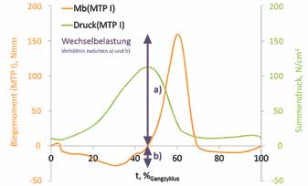 Der Unterschied der Belastungen wird in Abbildung 4 deutlich: Die grüne Kurve zeigt die plantare Druckbelastung im Bereich des MTP-I-Gelenks während eines normierten Gangzyklus. Die Druckbelastung steigt von Beginn des Gangzyklus an. Das Maximum erfolgt bei ca. 45 %, danach nimmt die Belastung bis zum Ende der Standphase ab. Der Biegebelastungsverlauf (orange Kurve) zeigt, dass am MTP-I-Gelenk Wechselbelastungen während des Gangzyklus auftreten. Bis ca. 45 % des Gangzyklus wird der Großzehenbereich Plantarflexionsmomenten ausgesetzt (negative Werte). Ab diesem Zeitpunkt wechselt die Belastungsrichtung, und ein Dorsalextensionsmoment (positive Werte) tritt auf. Die größte Ausprägung der Biegebelastung liegt bei ca. 60 % des Gangzyklus mit einem Maximum der Dorsalextension am Ende der Standphase. Die Abbildung zeigt, dass anhand des plantaren Druckes keine Information über diese Wechselbelastung vorliegt. Auch ist klar zu erkennen, dass die Maxima der zwei Belastungsarten zu unterschiedlichen Zeitpunkten stattfinden. Dies verdeutlicht nochmals die Dringlichkeit, je nach Versorgungsziel die tatsächlich relevante Belastungsform zu betrachten.