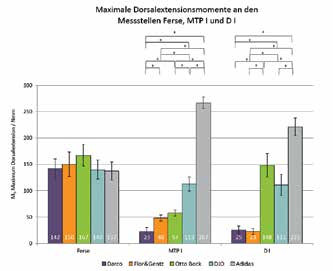 In den Ergebnissen zeigen sich an der Ferse keine signifikanten Unterschiede zwischen den Schuhen (Abb. 8). An MTP I und D I ergibt sich eine signifikante Reduktion des maximalen Dorsalextensionsmoments aller Testschuhe im Vergleich zur Neutralbedingung. An MTP I zeigen alle Werte signifikante Unterschiede; nur der Unterschied zwischen Fior & Gentz und Otto Bock ist nicht signifikant. Der Neutralschuh weist hier den höchsten Wert auf (267 Nmm ± 11 Nmm), den geringsten der Darco (23 Nmm ± 7 Nmm). An D I zeigt ebenfalls der Adidas den höchsten Wert (221 Nmm ± 17 Nmm), wohingegen der Fior & Gentz mit 23 Nmm ± 6 Nmm den geringsten Wert besitzt. Zwischen Darco und Fior & Gentz sowie zwischen Otto Bock und DJO besteht kein signifikanter Unterschied, alle anderen Kombinationen weisen signifikante Unterschiede auf. Zusammengefasst reduzieren alle Testschuhe die Biegemomente an MTP I und D I im Vergleich zum Adidas.