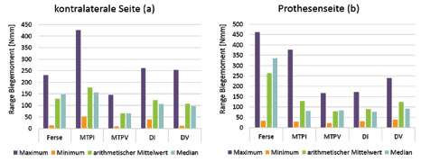 Neben dem charakteristischen Verlauf für die Biege- und Torsionsmomente wurden auch einzelne Parameter untersucht, die aus den Verläufen entnommen werden können. Abbildung 6 zeigt die Range, also die Summe der Beträge von dorsalem und plantarem Maximum. Dargestellt sind sowohl Maximum, Minimum und arithmetischer Mittelwert als auch Median der Range, zusammengefasst für alle Probanden, gemittelt über beide Messungen.