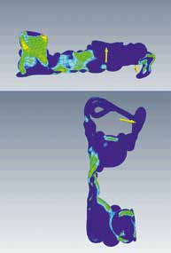 Die Fachleute in der 3D-Konstruktion bedienen sich bei der Erstellung des individuellen Hilfsmittels modernster Methoden zur Überprüfung der Hilfsmittelkonstruktion. Bereits im Vorfeld müssen hierzu Zielwerte definiert und entsprechende Konstruktionsvarianten getestet werden. Die zyklische Austestung von Dauergebrauchseigenschaften sowie die Durchführung maximaler Belastungstests (Abb. 9), die bis zu einem Bauteilbruch führen, sind dabei ebenso notwendig wie die Erprobung von Testkörpern, die spätere Überprüfungen im Rahmen der Produktion ermöglichen. Die ermittelten Norm-Belastungswerte fließen neben den Proportionen als Kenngrößen in eine Struktursimulation ein, die im Rahmen der Finite-Elemente-Methode (FEM) auf das jeweils konstruierte Hilfsmittel angewandt wird (Abb. 10).