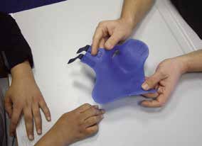 Die Verfasser nutzen hierbei die Dynamik des Materials Silikon, das Bewegungen zulässt. Manche Kinder benötigen z. B. die Bewegungsmöglichkeit in Richtung Palmarflexion im Handgelenk, um Gegenstände loslassen zu können. In diesen Fällen wird das Handgelenk manchmal in der Nullstellung eingestellt. Bei einer Aufrichtung des Handgelenks wird eine geringe Silikonstärke gewählt, damit eine Bewegungsmöglichkeit Richtung Palmarflexion gegeben ist. Diese Flexibilität des Silikons ist ein wesentlicher Grund für die hohe Akzeptanz bei den Kindern und für die meist hohe Tragedauer am Tag. Je fester eine Orthese ist, desto mehr wird sie als Fremdkörper wahrgenommen. Selbst Materialien, die auf den ersten Blick weich und elastisch erscheinen, wie die Gruppe der Low-Density-Polyethylene (z. B. „Streifyflex“ oder „Erkoflex“), sind im Praxistest nicht zielführend und werden in aller Regel schlecht akzeptiert.
