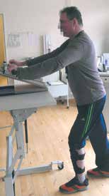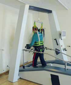 Auch das Gehen konnte stetig verbessert werden. Eine kritische Bewertung der bisher eingesetzten Hilfsmittel zeigte, dass die erstmals 2013 verordnete Fußheberorthese zu schwach war, um genügend Standsicherheit zu gewährleisten (Abb. 5). Nach Umstellung auf eine feste Carbonorthese (Dynam X) mit Orthesenschuh (Sporlastic Footcare) und eine maßgefertigte Einlage konnte die Standsicherheit erheblich erhöht, das „Durchschlagen“ des Kniegelenks verringert und somit die Kniekontrolle verbessert werden (Abb. 6). Diese Hilfsmitteloptimierung war eine wesentliche Voraussetzung für die erfolgreiche Fortsetzung der Gangrehabilitation. In deren Rahmen erhielt der Patient zusätzlich zur intensiven Physiotherapie ein vollautomatisiertes endeffektorbasiertes Gangtraining im GT 1 und im Lyra (Abb. 7).