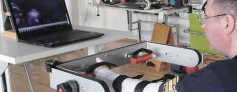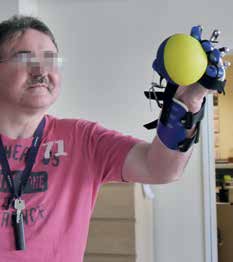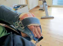 Die aktive Beweglichkeit des linken Armes sowohl im Schulter- als auch im Ellenbogengelenk konnte durch ein repetitives, gerätegestütztes Training, einen speziellen Therapieparcours (Abb. 2) sowie den Einsatz eines Exoskelett-Therapiegeräts kontinuierlich verbessert werden. Im Eigentraining der Arm- und Beinfunktion nutzt der Patient einen Bewegungstrainer mit Biofeedback. Die individuell angepasste zirkuläre Armorthese wird weiterhin zum Erhalt der Beweglichkeit getragen. Zusätzlich trägt der Patient zur Detonisierung der Hand- und Fingermuskulatur zeitweise einen Johnstone-Splint.