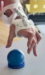 Durch die langfristige Kombination von Physio- und Ergotherapie, medikamentöser Behandlung, individueller Orthesenversorgung und strukturiertem Eigentraining konnte die Beweglichkeit der Hand- und Fingergelenke erheblich verbessert werden. Im Rahmen der Behandlung wurde das passive gleichzeitige Strecken aller Fingergelenke möglich. Dadurch eröffneten sich neue Behandlungsoptionen, zum Beispiel das Training mit einer funktionellen dynamischen Orthese (Saebo Flex). Mit dieser Orthese konnte der Patient jetzt, sieben Jahre nach Erkrankungsbeginn, erstmals mit seiner stark betroffenen linken Hand Gegenstände aktiv greifen (Abb. 3). Durch eine feste Therapiestruktur und hohe Wiederholungszahlen ließ sich die Handfunktion so ausbauen, dass erste Gegenstände auch schon ohne Orthese aktiv gegriffen werden können (Abb. 4).