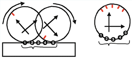 Das Roll-over-Shape-Verfahren (ROS), entwickelt von A. H. Hansen (2002), ist von ihm definiert als reproduzierbare Abrollgeometrie, die mithilfe der Koordinatentransformation den Kraftangriffspunktverlauf (COP) auf ein körperfestes Koordinatensystem bezieht und vom ipsilateralen bis zum kontralateralen Fersenkontakt beschrieben wird 32. Über das ROS-Verfahren ist es möglich, qualitativ eine Formgestaltung zu beschreiben. Zur Veranschaulichung können bekannte Geometrieformen wie zum Beispiel ein Fahrradreifen mit Ventil verwendet werden. Bei der seitlichen Betrachtung eines fahrenden Radfahrers bewegt sich das Ventil auf und ab (Abb. 2a). Schaut man jedoch von der Fahrradnabe auf das Ventil, kreist es um die Nabe und spiegelt die Abrollgeometrie (ein Kreis) wider.