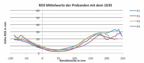 Die mittleren ROS-Verläufe des 1D35 (Abb. 8) zeigten homogene und reliable Formveränderungen bis zur terminalen Standphase. Ab dem Ende der terminalen Standphase und Vor-Schwungphase verläuft der Kraftangriffspunkt ausschließlich im Vorfußbereich; dort nahmen die Unterschiede signifikant zu. Das führt dazu, dass die Probanden 2 und 4 einen größeren Hebelarm zur Verformung des Vorfußbereiches benötigen, um die Abrollung einzuleiten. Die Abrolllängen bei diesen Probanden lagen bei 156 mm der Abrollstrecke; die Probanden 1 und 3 beendeten den Schritt schon bei 131 mm. Ab einer Abrolllänge von 175 mm stiegen die intraindividuellen Standardabweichungen stark an – bis zu einem Maximum von 10 mm. Nur Proband 2 konnte gut reproduzierbare Abrollvorgänge erzielen. Dessen Standardabweichungen lagen über die gesamte Standphase unter 2 mm.