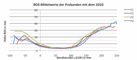 Bei der qualitativen Betrachtung der mittleren ROS-Verläufe des 1D10 (Abb. 7) zeigten sich deutliche interindividuelle Unterschiede in der Belastungsübernahme und zu Beginn der mittleren Standphase, die sich ab der Hälfte der Standphase wieder anglichen. Diese Abweichungen traten auch intraindividuell auf und zeigten hohe Standardabweichungen von bis zu 8,5 mm in der ersten Phase der Standphase. Die Fersenmaterialien des 1D10 wurden bis zu 13 mm unterschiedlich stark verformt. Die Angleichung der Verformungsunterschiede fand in der Mitte der mittleren Standphase statt. Die Abrolllängen über den Vorfußbereich bis zum Fersenauftritt der kontralateralen Beinseite waren zwischen den Probanden unterschiedlich: Proband 1 beendete den Abrollvorgang nach 143 mm Abrollstrecke, Proband 2 nach 138 mm, Proband 3 nach 133 mm; Proband 4 rollte mit einer Abrolllänge von 148 mm am weitesten über den Vorfuß ab. In der bipedalen Standphase stiegen die Standardabweichungen der Probanden 1 und 2 auf maximal 4,5 mm.