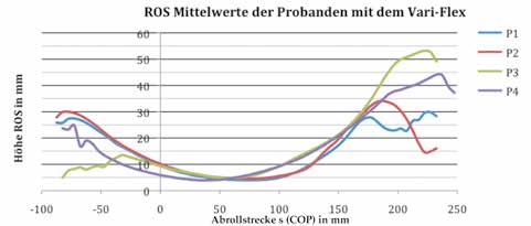 Bei der Betrachtung, wie lange die Probanden mit dem Vari-Flex-Fuß über den Vorfuß abrollen, wurden bei 3 von 4 Probanden ähnliche Abrolllängen festgestellt. Proband 1 schloss die monopedale Standphase nach einem Abrollweg von 163 mm ab, Proband 2 nach 176 mm und Proband 4 nach 170 mm. Proband 3 verblieb am längsten auf dem Prothesenfuß. Er erreichte eine Abrollstrecke von 193 mm. In der bipedalen Standphase verhielten sich die ROS-Verläufe individuell. Die Probanden 3 und 4 versuchten weit über den Vorfuß abzurollen, die anderen beiden Probanden brachen den Abrollvorgang nach Beendigung der monopedalen Standphase ab.