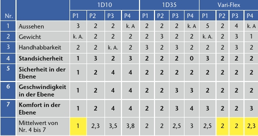 Die Auswertung der subjektiven Bewertungen der verschiedenen Prothesenfußpassteile ergab, dass die Probanden 2 und 4 sich eindeutig für den Vari-Flex-Fuß entschieden (Tab. 1). Bei den Probanden 1 und 3 lagen die subjektiven Einschätzungen der verschiedenen Prothesenfüße sehr dicht beieinander. Proband 1 favorisierte den 1D10 durch das leichte Überrollen über den Vorfuß, Proband 3 sah geringe Vorteile beim Vari-Flex.
