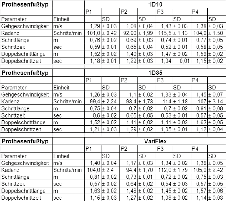 Die Ergebnisse der instrumentellen Ganguntersuchung zeigten bei den Probanden 2, 3 und 4 die größte Kongruenz zur erhaltenen Seite mit dem Vari-Flex, bei Proband 1 war diesbezüglich der 1D10 am besten. Bei den kinematischen Ergebnissen waren die Resultate mit dem Vari-Flex bei den Probanden 1 und 2 besser gegenüber 1D10 und 1D35 (Tab. 2). Vor allem bei der selbst gewählten Gehgeschwindigkeit erhöhten sich die Werte um mehr als 5 %. Bei den Probanden 3 und 4 wurden nur geringfügige Unterschiede in Bezug auf Gehgeschwindigkeit und Schrittlänge deutlich, Proband 3 zeigte leichte Vorteile mit dem 1D10, Proband 4 mit dem 1D35.