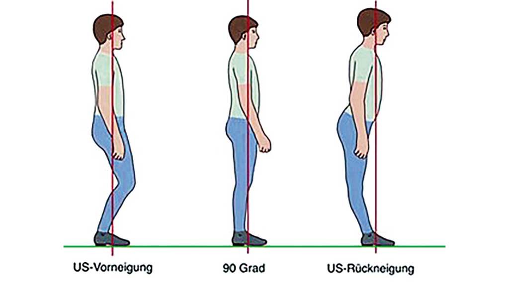 Der Unterschenkel-Boden-Winkel liegt bei ca. 90° zum Boden (bis zu 7° Vorneigung gilt als physiologisch). Eine übermäßige Vorneigung führt zu einer kompensatorischen Kniebeugung, um den Körperschwerpunkt über der Unterstützungsfläche zu halten.
