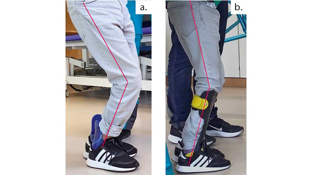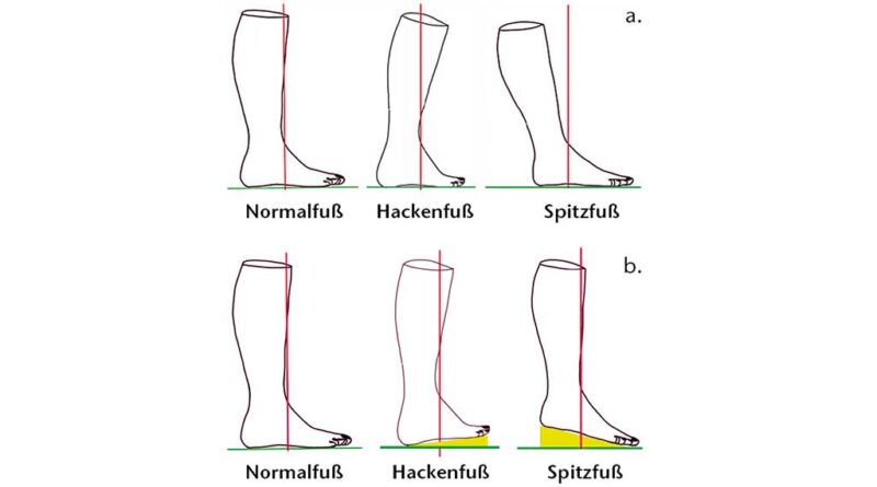 Durch einen Spitz­fuß­aus­gleich wird der Boden näher an die Fer­se gebracht, wodurch eine kom­pen­sa­to­ri­sche Aus­gleichs­be­we­gung über­flüs­sig wird. Trotz des patho­lo­gisch ver­än­der­ten Win­kels im obe­ren Sprung­ge­lenk kann der Unter­schen­kel in Ver­bin­dung mit einer Fer­sen­er­hö­hung in einem Win­kel von ca. 90° zur Boden­ebe­ne posi­tio­niert wer­den10 (Abb. 3b).