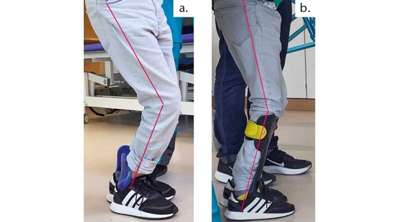 Die Beweg­lich­keit des obe­ren Sprung­ge­lenks ist häu­fig durch patho­lo­gi­sche Ver­än­de­run­gen ein­ge­schränkt, was den Win­kel zwi­schen Fuß und Unter­schen­kel vor­gibt (Abb. 3a). Ein anschau­li­ches Bei­spiel hier­für ist ein kon­trak­ter Spitz­fuß. Wird die­ser nicht durch eine Fer­sen­er­hö­hung aus­ge­gli­chen, kann fol­gen­de kom­pen­sa­to­ri­sche Bewe­gung auf­tre­ten: Die betrof­fe­ne Per­son ver­sucht, die Unter­stüt­zungs­flä­che zu ver­grö­ßern und die Fer­se zum Boden zu brin­gen, um nicht aus­schließ­lich auf den Zehen­spit­zen lau­fen zu müs­sen. Auf­grund der Dor­sal­ex­ten­si­ons-Ein­schrän­kung im obe­ren Sprung­ge­lenk gelingt dies jedoch nur durch eine Rück­nei­gung des Unter­schen­kels, was zu einem Genu recur­va­t­um führt9.
