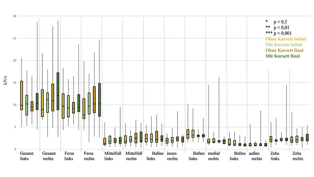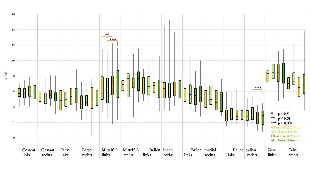 Beim Tragen eines Korsetts wurden signifikante p‑Werte von p = 0,001 (r: 0,46 bzw. 0,48) für den rechten Mittelfußbereich und den äußeren Ballen des rechten Fußes festgestellt (Medianwerte: rechter Mittelfuß vor der Therapie 3,16 N/m², nach der Therapie 2,70 N/m²; äußerer Ballen des rechten Fußes vor der Therapie 5,40 N/m², nach der Therapie 4,78 N/m²). Für die übrigen Parameter konnten keine signifikanten Unterschiede festgestellt werden (Abb. 2).