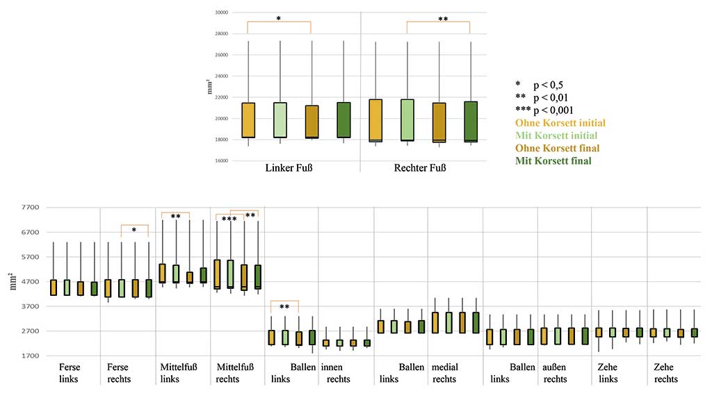 Ein Vergleich der Messungen mit Korsett vor und nach der Therapie zeigte signifikante Unterschiede für den gesamten rechten Fuß (p = 0,01, Median vor der Behandlung 17.950,00 mm², Median nach der Behandlung 17.937,50 mm², r: 0,44), die rechte Ferse (p = 0,03, Median vor und nach der Behandlung 4.075 mm², r: 0,60) und den rechten Mittelfuß (p = 0,01, Median vor der Behandlung 4.500 mm², Median nach der Behandlung 4.495,83 mm², r: 0,44). Für die übrigen Vergleiche konnten keine signifikanten Unterschiede festgestellt werden (Abb. 3).