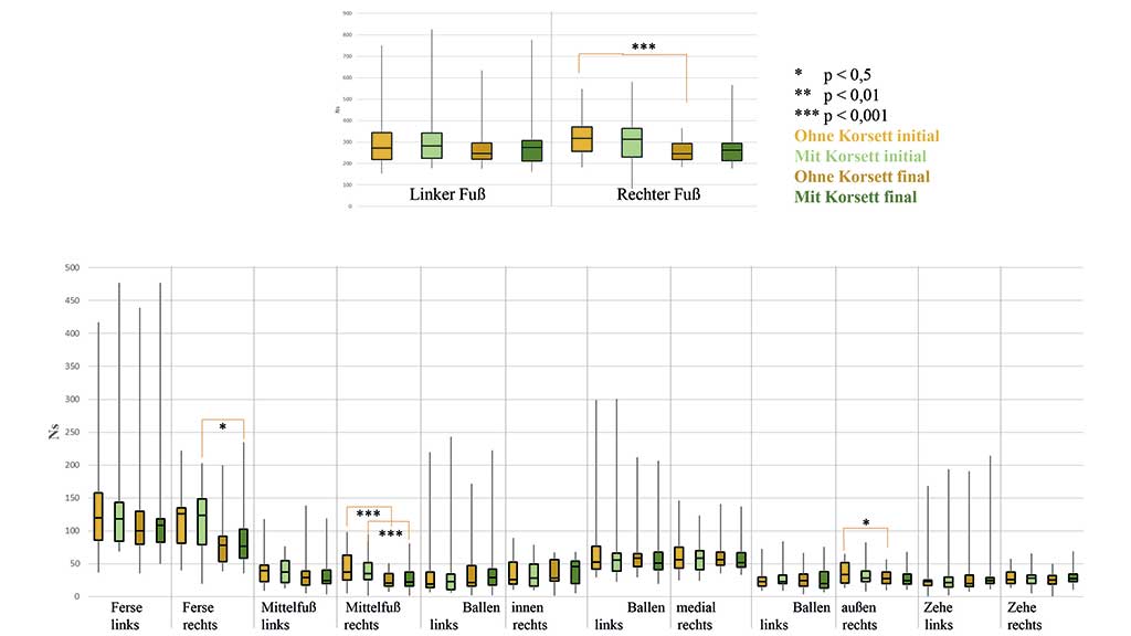 Der Vergleich der Daten ohne Korsett vor und nach dem Aufenthalt ergab signifikante Unterschiede für den gesamten rechten Fuß (p = 0,001, Median vor der Behandlung 316,93 Ns, Median nach der Behandlung 244,65 Ns, r: 0,45) und den rechten Mittelfuß (p = 0,001, Median vor der Behandlung 37,27 Ns, Median nach der Behandlung 20,46 Ns, r: 0,55).