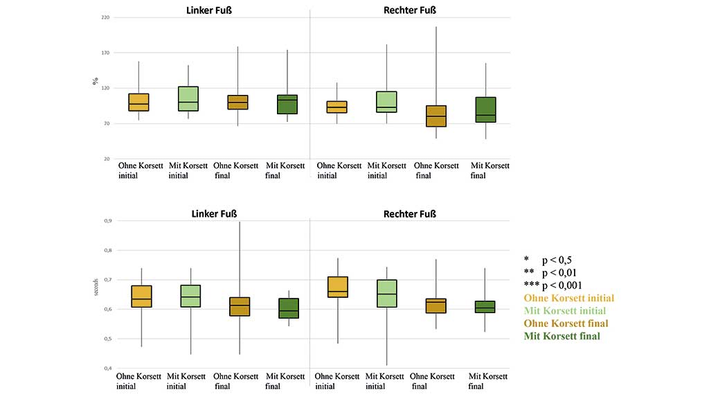 Der Vergleich der Impulsdaten mit und ohne Korsett vor und nach dem stationären Aufenthalt zeigte keine Signifikanz für den linken oder rechten Fuß.