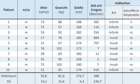 Zehn Schlaganfallpatienten (5 m, 5 w) mit spastischer Hemiparese wurden ganganalytisch untersucht. Von diesen Patienten haben vier einen hämorrhagischen Infarkt und sechs einen ischämischen Insult erlitten. Dabei waren dreimal die linke und siebenmal die rechte Körperseite betroffen (Tab. 1).