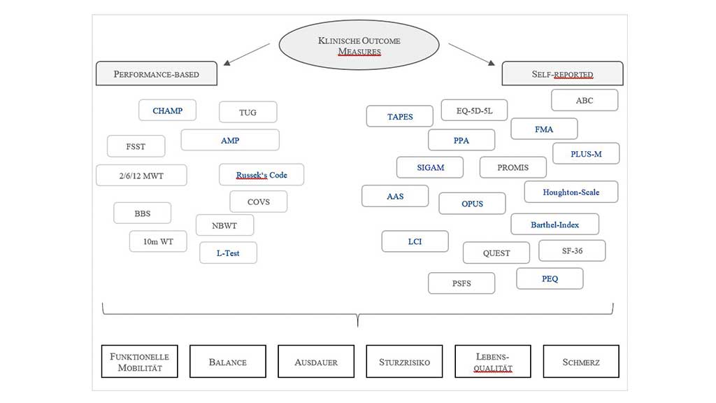 Die gegenwärtig angewendeten OM weisen unterschiedliche Ursprünge auf. Wie in Abbildung 1 dargestellt, sind einige OM speziell für die Anwendung bei Menschen mit Amputation (der unteren Extremität) konzipiert (blaue Markierung); eine Vielzahl der OM stammt jedoch aus anderen medizinischen Bereichen und wurde beispielsweise für die Anwendung bei neurologischen Krankheitsbildern entworfen. Dies führt insgesamt zu einer hohen Anzahl an verfügbaren bzw. verwendeten OM 3.