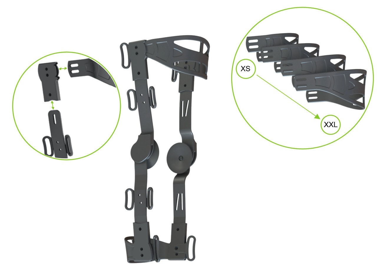 Vorgeschlagen wird ein Modulorthesen-Baukasten, der eine patientenindividuelle Konfiguration der Orthese auf der Grundlage standardisierter Module zulässt. Das Konzept sieht zu diesem Zweck eine Teilung der Orthese in eine obere und untere Rahmenspange, eine linke und rechte Gelenkschiene sowie Verbindungselemente zur Kopplung von Gelenkschienen und Rahmenspangen vor. Die Rahmenspangen werden in verschiedenen Größen angeboten, sodass sie unabhängig von einem normativen Größenzusammenhang zwischen Unter- und Oberschenkel frei kombiniert werden können. Unterschiedlich vorgeformte Schienen ermöglichen zum einen die freie Kombination der Spangen, ohne die Parallelität der Orthesengelenke zu beeinträchtigen, zum anderen die Anpassung der Orthese an die individuelle Beinkontur des Trägers. Auf diese Weise lassen sich etwa auch Varus-/ Valgus-Fehlstellungen individuell versorgen. Durch Langlöcher in den Verbindungsenden der Ober- und Unterschenkelspangen ist eine Anpassung der Spangenweite möglich, durch die das Orthesengelenk in der Sagittalebene in Kongruenz mit der Kompromissdrehachse des Kniegelenks positioniert werden kann. In gleicher Weise erlauben Langlöcher in den Verbindungsenden der Schienen eine Höhenverstellung, die eine Anpassung der Orthese an unterschiedliche Beinlängen gestattet. Mit Hilfe einer Maßtabelle kann der Orthopädietechniker die Orthese zur sofortigen mobilen Versorgung selbst zusammenstellen oder beim Hersteller passgenau bestellen. Abbildung 3 veranschaulicht das propagierte Konzept des Modulorthesen-Baukastens, welches prototypisch im Rahmen eines Forschungsprojekts umgesetzt wurde.
