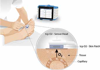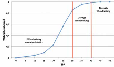 Nachdem das Osseointegrationsverfahren nun bei einer sorgfältig ausgewählten Population von Amputierten sicher erschien, wurde dazu übergegangen, vorsichtig neue Kandidaten mit etwas weniger strengen Indikationskriterien aufzunehmen und zudem weitere Kriterien hinzuzufügen, um zwischen Patienten mit schwerer und leichter peripherer arterieller Verschlusskrankheit zu unterscheiden (Tab. 1 u. 2). Bei Patienten mit vaskulärer Amputationsursache nahm der Gefäßchirurg (MW) ein Screening vor und überprüfte bei ihnen das Vorhandensein von Pulsationen der Oberschenkelarterie im Leistenbereich. Das Kriterium der palpablen Pulsschläge der Oberschenkelarterie ging aus einer Studie an Patienten mit kritischer Beinischämie hervor. Die Ergebnisse dieser Studie deuteten darauf hin, dass das Vorhandensein palpabler Pulsschläge direkt proximal zur Amputationshöhe einer hundertprozentigen primären Wundheilung nach der Amputation entspricht 5. Zusätzlich dazu wurde der mit Laser-Doppler-Technik an der Spitze des Stumpfes gemessene Hautperfusionsdruck (Abb. 2) zur Messung des lokalen mikrozirkulatorischen Blutflusses eingeführt. Das Verfahren basiert auf der Ermittlung des Sauerstoffdrucks in der Haut mittels eines Laserstrahls, der von einem faseroptischen Sensor geführt wird, welcher auf der Haut platziert wird. Ein transkutaner Sauerstoffdruck von unter 40 mmHg wurde als Ausschlusskriterium für eine Osseointegrations-OP festgelegt. Ein Sauerstoffdruck von weniger als 40 mmHg an der Amputationsstelle wird in der Literatur als positiver prädiktiver Wert für ein Fehlschlagen der Wundheilung nach der Amputation bei Patienten mit kritischer Beinischämie angegeben (Abb. 3) 6. Für die Osseointegration eines Implantats sind vitale Haut- und Weichgewebebedingungen mit adäquater lokaler Durchblutung notwendig, um eine erfolgreiche Osseointegration und eine ausreichende Resistenz gegen bakterielle Infektionen im Hautpenetrationsbereich (Stoma) zu erzielen. Die Autoren gingen davon aus, dass der Hautperfusionsdruck, der eine ordnungsgemäße Wundheilung gewährleistet, auch die Bedingungen für eine erfolgreiche Osseointegration bei Patienten mit vaskulär bedingten Amputationen garantiert.