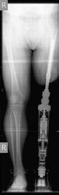 Bei der Durchführung des Indikationsverfahrens wird von den Autoren ein multidisziplinärer Teamansatz verfolgt. Das Behandlungsteam für die Osseointegration besteht aus einem orthopädischen Chirurgen, einem Fallmanager, einem Rehabilitationsmediziner und einem Physiotherapeuten. Patienten, die zur Implantation einer knochenverankerten Prothese überwiesen werden, werden vom Fallmanager in eine ambulante Gruppenklinik eingeladen. Vor ihrem Besuch füllen sie den Fragebogen für Personen mit einer transfemoralen Amputation (Q‑TFA) aus 1. In der ambulanten Gruppenklinik wird zunächst eine radiologische Untersuchung des verbleibenden Femurs bzw. der verbleibenden Tibia durchgeführt und eine kalibrierte Gesamtansicht der beiden unteren Extremitäten angefertigt (Abb. 1a). Bei Patienten mit Unterschenkelamputation oder mit kurzem Oberschenkelstumpf wird ein CT-Scan durchgeführt. Mit diesem CT-Scan werden die Größe und das Design des anzufertigenden kundenspezifischen Implantats ermittelt. Sämtliche Einzelheiten der Behandlung werden im Rahmen einer Plenarsitzung vom Chirurgen und vom Rehabilitationsmediziner vorgestellt, gefolgt von Einzelberatungen mit dem gesamten Osseointegrationsteam. Während der Einzelgespräche werden dem Rest der Kandidaten und ihren Angehörigen zwei Personen mit knochenverankerter Prothese vorgestellt, die ihre Rehabilitation erfolgreich abgeschlossen haben. Diese berichten den neuen Kandidaten von ihren Erfahrungen und zeigen ihnen ihre knochenverankerte Prothese. Abschließend wird ein gemeinsamer Konsens in Bezug auf die Indikation zur Behandlung auf Grundlage der Ein- und Ausschlusskriterien 2, der Krankengeschichte, der körperlichen Untersuchung, der Q‑TFA-Ergebnisse sowie der Radiographie erzielt. Kandidaten mit unrealistischen Erwartungen an ihre zukünftige Funktionsfähigkeit mit einer knochenverankerten Prothese werden an die klinischen Psychologen zum Gespräch überwiesen, um ihre Erwartungen zu korrigieren, die wahrscheinlich zu hoch sind.