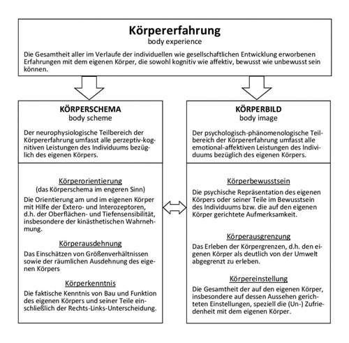 - Das Konstrukt Körperschema (somatisch) bezieht sich kurz gefasst auf den perzeptiven, physiologisch vorgeformten und zentralnervös verankerten Teilaspekt des Körpererlebens. Es hat eine basale Funktion bei der Lokalisation des Körpers und der Steuerung der Motorik im Raum und wird durch das Körperempfinden, d. h. die intero- und exterozeptive Wahrnehmung (Körperperzepte genannt), komplettiert.