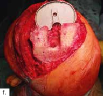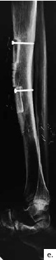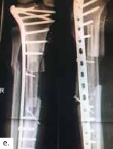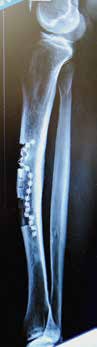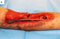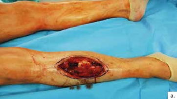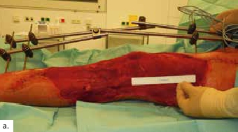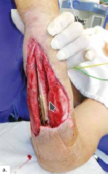 Nach einem kindlichen Trauma entwickelte ein 36-jähriger Mann eine chronische Tibiaschaftosteitis mit großer Defektwunde. Die Sanierung der Staphylococcus-aureus-positiven Osteitis erfolgte durch unfallchirurgische serielle Debridements der Knochen und Weichteile (Abb. 1a) und durch lokale und systemische Antibiotikagabe. Nach dreifach negativen Abstrichen wurden die durch die Markraumausfräsung entstandenen Tibiadefekte (Abb. 1b) mit einer an der A. tibialis posterior vaskularisierten, segmentierten Fibula (Abb. 1c) rekonstruiert. Um den Integumentdefekt neben der Fibulamonitorinsel und die freiliegende Tibia komplettierend zu decken, wurde an das distale Ende der A. fibularis des Knochentransplantats ein freier M.-gracilis-Muskellappen angeschlossen; die Fibula diente somit als Durchflusslappenplastik (Abb. 1d). Die Knochentransplantate wurden mit Einzelschraubenosteosynthesen gesichert und zeigen zehn Wochen postoperativ bereits Zeichen einer knöchernen Einheilung (Abb. 1e). Der Heilungsverlauf der Integumentrekonstruktion gestaltete sich ebenfalls unauffällig (Abb. 1f). Nach dreimonatiger Entlastung an Unterarmgehstützen und sechsmonatiger Kompressionsstrumpftherapie geht der Patient inzwischen volllastig ohne Gehhilfen.