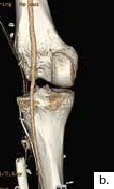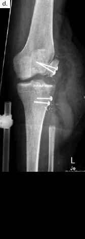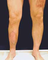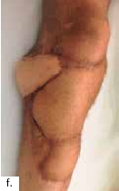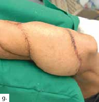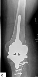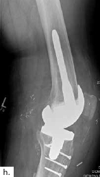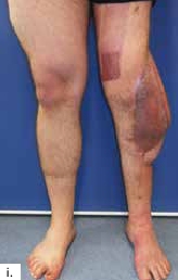 Sechs Monate später konnte bei solide eingeheiltem Knochenblock (Abb. 2f) eine teilgekoppelte Kniegelenkprothese implantiert werden, deren Bedeckung in der Folge durch die ausreichend dimensionierten Lappenplastiken unproblematisch war (Abb. 2g u. h). Der Patient erzielte nach Rehabilitationsmaßnahmen eine vollständige Belastungsfähigkeit bei freier Kniegelenkbeweglichkeit und solide verheiltem Integument (Abb. 2i u. j).