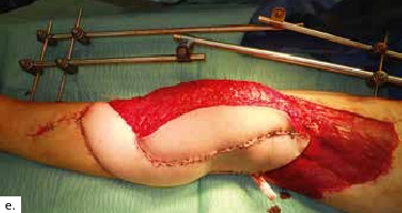 Ein 28-jähriger Motorradfahrer kollidierte mit einem Pkw und erlitt eine Defektfraktur der linken proximalen Fibula und einen Verlust der lateralen Femurkondyle inklusive des lateralen Bandapparates unter einem extrem großen Weichteildefekt (Abb. 2a u. b). Nach multiplen auswärtigen Debridements wurde nach Zuweisung ins eigene Haus interdisziplinär besprochen, die Extremität mit einer Kniegelenkprothese und einer plastisch-chirurgischen Defektdeckung zu erhalten. In einem ersten Schritt wurde ein kontralateraler Tensor-fasciae-latae-(TFL-) Lappen umschnitten („flap delay“), um ihn in seiner gesamten Länge vom Beckenkamm bis zum Knie heben zu können. Eine Woche später erfolgte die Konstruktion der fabrizierten Chimärlappenplastik durch Hebung des osteofasziokutanen TFL-Transplantats inklusive eines vaskularisierten Beckenkammblocks und der mikrovaskuläre Anschluss End-zu-End an den Serratusabgang der A. thoracodorsalis des rechten muskulokutanen M.-latissimus-dorsi-Lappens (Abb. 2c). Dieses sehr große zweiblättrige Lappenmodul wurde anschließend End-zu-End an die Vasa gastrocnemia lateralis anastomosiert und die vaskularisierten Einzelkomponenten wie folgt verteilt: Der Beckenkammblock fungierte als laterale Kondylenaugmentation, um den Sitz einer späteren Knieendoprothese zu optimieren; die Faszia lata wurde zur Stabilisierung von diesem Block transossär an die verbleibende Fibula und das laterale Tibiamassiv genäht (Abb. 2d). Die ausgedehnten Lappenplastiken dienten zum Defektverschluss, gemeinsam mit zusätzlichen Spalthauttransplantaten (Abb. 2e). Nach sechswöchiger Abheilung im Fixateur externe erfolgten der Umschulungsbeginn und die Mobilisation an Unterarmgehstützen mit Fußsohlenteilkontakt.