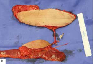 Die mikrovaskuläre Verbindung der Chimärenlappenmodule kann entweder End-zu-End („sequential“) oder End-zu-Seit („internal“) erfolgen 10. In beiden Fällen besteht das Risiko einer thrombotischen Komplikation und damit eines Lappenverlustes: bei den sequenziellen Lappen für den nachgeschalteten Lappen, bei den End-zu-Seit-Konstrukten sogar für beide Lappen. Deshalb empfiehlt es sich, jeden Lappen einzeln zu überwachen, z. B. über eine Monitorinsel oder eine implantierbare Dopplersonde. Tatsächlich ist jedoch die Verlustrate fabrizierter Lappen vergleichbar mit Einzellappentransplantaten, sofern eine adäquate mikrochirurgische Routine vorliegt 11 12 13 14. Nach eigener Erfahrung der Verfasser ist bisher kein einziges Transplantat von 15 fabrizierten Chimärenlappensystemen, bestehend aus jeweils zwei Einzelkomponenten, verlorengegangen.