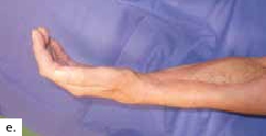 Ein polytraumatisierter Mann erlitt eine Ulnafraktur mit einem Kompartmentsyndrom an seinem linken Unterarm. Aufgrund der lebensbedrohlichen anderen Diagnosen und daher sekundär priorisierter Kompartmentspaltung verlor er sukzessive seine gesamte Beugemuskulatur an dieser Hand. Nach Stabilisierung der Klinik des Patienten resultierte schließlich ein ausgedehnter ulnarer Weichteildefekt mit inzwischen osteosynthetisierter, jedoch freiliegender Ulna und stark vernarbten Weichteilen (Abb. 3a). Die Gefäße am Unterarm waren technisch nicht mehr präparierbar. Dieses rekonstruktive Problem konnte nicht mit einem einzelnen Transplantat gelöst werden. Daher wurde ein fabrizierter Chimärenlappen aus einem großen Oberschenkellappen (ALT-Lappen) und einem funktionellen M.-gracilis-Lappen zusammengesetzt (Abb. 3b) und als Modul in der Ellenbeuge reanastomosiert. Der als Durchflusslappen dienende ALT-Lappen verschloss die Ulnarseite des Unterarms und bedeckte den Knochen. Der an die Gefäße des M. rectus femoris der A. circumflexa femoris lateralis anastomosierte muskulokutane Gracilislappen dagegen wurde in die Beugesehnen der Finger eingeflochten und mit seinem motorischen Nerv an den noch präparierbaren motorischen Nerv der absenten M.-flexor-digitorum-profundus-Muskulatur (Abb. 3c, ellenbogennahe blaue Markierung) koaptiert. Im Zeitraum eines Dreivierteljahres besserten sich Kraft und Beweglichkeit der Finger und des Daumens, sodass der Patient einen kraftvollen Hakengriff aller Finger entwickeln konnte (Abb. 3d). Intensive Physio- und Ergotherapie sowie angepasste dynamische Beuge- und Streckkorrekturschienen wurden stationär begonnen und ambulant fortgeführt. Ein voller Faustschluss war aufgrund der komplexen Vorgeschichte und des klinischen Gesamtbildes allerdings nicht mehr möglich. Das Ziel des funktionellen Extremitätenerhalts wurde jedoch erreicht (Abb. 3e).