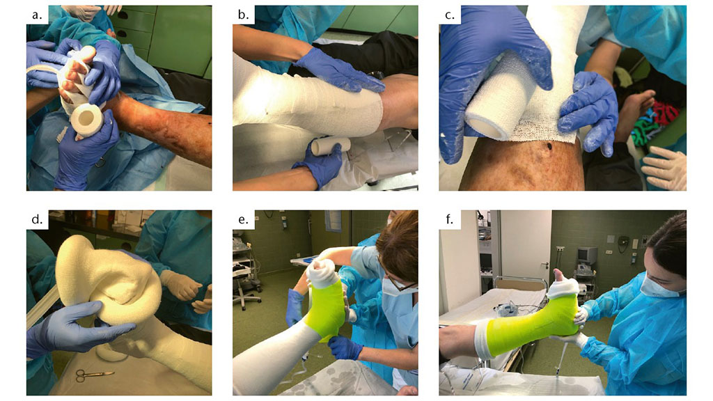 Ist die diagnostische Abklärung beim Patienten abgeschlossen, folgt in der Klinik der Autoren bei infizierten und entzündeten Füßen die erste Maßnahme: das Auftragen des gekühlten Zinkleimverbandes (Abb. 2a–f). Dieser wirkt kühlend und durch milde Kompression im zeitlichen Verlauf abschwellend, mäßigend und im Umfang reduzierend. Zusätzlich neutralisieren die positiv geladenen Zinkatome Entzündungsmediatoren und führen zu einem Verblassen der Rötung 13. Man sollte darauf achten, so die Erfahrung der Autoren, dass der Zinkleimverband nicht zu eng aufgetragen wird, damit es zu keiner Strangulationswirkung kommt. Um in diesem Punkt sicherzugehen, kann der Verband ventral in einer vorderen Schlaufe aufgetragen werden, sodass die Strangulationswirkung verhindert wird. Dabei wird die Binde nicht in strikten Touren um das Bein gewickelt, sondern ventral immer eine Tour in einer halben Schlaufe aufgebracht. Im Rahmen der weiteren Gipsanlage wird der Fuß orthograd reponiert, sodass eine gleichmäßige plantigrade Belastungssituation erreicht wird. Im Anschluss folgt das Aufbringen der inneren Kompressionspolsterung, indem ein Trikot-Kompressionsschlauch, der auf doppelter Länge abgemessen wird, jeweils nach innen und nach außen gerollt wird. Über der inneren Kompressionspolsterung wird nunmehr noch ein drittes Kompressionstrikot aufgebracht, das sich mit dem Gips verbindet. Sobald dieses Aufbringen der gerollten Kompressionstrikots beendet ist, kann der eigentliche Gipsvorgang des reponierten Fußes mit ca. vier Gipsbinden beginnen. Dabei ist darauf hinzuweisen, dass sogar eine zuvor angebrachte Vakuumversiegelung (siehe Abb. 1b) mit eingegipst werden kann. Die Trikotschlauchenden werden am Ende des Gipsvorganges nach außen umgeklappt und liegen abschließend an den Enden des offenen Gipses. Diese Kante ist für die Bewertung des klinischen Verlaufs entscheidend, weil hieran u. a. das Abschwellen des Fußes und des Beines am nächsten Tag beurteilt werden kann. Im besten Falle kann eine ganze Patientenhand unter den Gips geführt werden, wenn unter guter Lagerung eine optimale Basis für die Abschwellung gegeben ist. Auch ein manuelles Klopfen zeigt am nächsten Tag das Maß des Abschwellens im Gipsverband. Zusätzlich kann der orthopädische Chirurg noch Kinesiotapes im anatomischen Verlauf der Lymphbahnen aufbringen und täglich einmal eine Elektrotherapie initiieren. Eine manuelle Lymphdrainage kann jederzeit bereits die Leisten- und Knieregion freimachen. Sie stellt auch deshalb keine Gefahr dar, weil eine intensivierte antibiotische Therapie die Gefahr einer Sepsis und eine manuelle Verschleppung ausschließt. Am Tag nach der Gipsanlage und nach erneuter klinischer Statusuntersuchung wird der Gips gespalten, der Deckel entfernt und nach klinischer Untersuchung ein neuer Zinkleimverband angebracht.