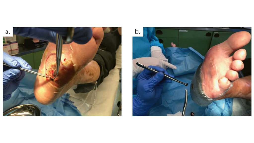 Wenn beispielsweise der akute und infizierte diabetische Fuß, insbesondere der Charcot-Fuß, bei der stationären Aufnahme eine Wunde (Abb.1a u. b) aufweist, beginnt in der Klinik der Autoren nach der Anamnese und klinischen Befundung die akute initiale Wundversorgung. Dabei wird die Wunde nicht nur chirurgisch debridiert oder gereinigt, es werden auch bakteriologische Abstriche vorgenommen, die bei den sich anschließenden Operationen mit den dazugehörigen Resistogrammen die Grundlage des chirurgischen Erfolges bilden 8. Ist hingegen keine Wunde vorhanden, wird der Patient nach der Diagnostik umgehend der TCC-Versorgung innerhalb der Klinik zugeführt. In zahlreichen Publikationen wird von den positiven Effekten einer Kompressionstherapie berichtet, teilweise auch in Kombination mit einem Zinkleimverband 9 10. Allerdings gelten sowohl chronische venöse Insuffizienz als auch periphere arterielle Verschlusskrankheit (pAVK) als Kontraindikationen 11; somit wird diese Behandlungsoption häufig nicht in Erwägung gezogen, obwohl es unter bestimmten Bedingungen sinnvoll wäre 12. Inwiefern auch bei einem akuten und infizierten diabetischen Fuß unter bestimmten Voraussetzungen eine Kompressionstherapie eingesetzt werden kann, wird nachfolgend diskutiert.