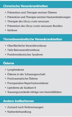 Die Liste der guten Indikationen für eine effektive Kompressionstherapie der Beine ist lang (Abb. 1). In der 2019 neu überarbeiteten und interdisziplinär erstellten S2k-Leitlinie zur medizinischen Kompressionstherapie der Extremitäten1 wird auch die sehr gute Evidenz für verschiedene phlebologische und lymphologische Erkrankungen dargestellt.
